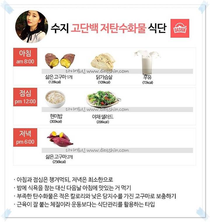 スジのダイエットメニューは他のK-POPアイドルグループと同様に高たんぱくで低炭水化物の食事が中心になっています☆